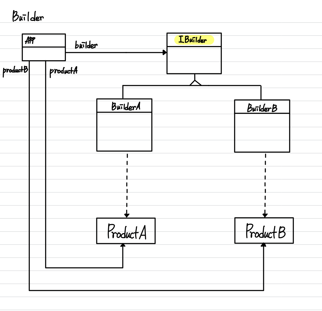 우리는 현재 builder라는 대상에게 object의 생성을 넘겼습니다. 그렇기 때문에 우리는 productA, productB라는 object가 정확하게 무엇인지 알고 있지만, 이를 만드는 방법은 모르는 상태입니다.