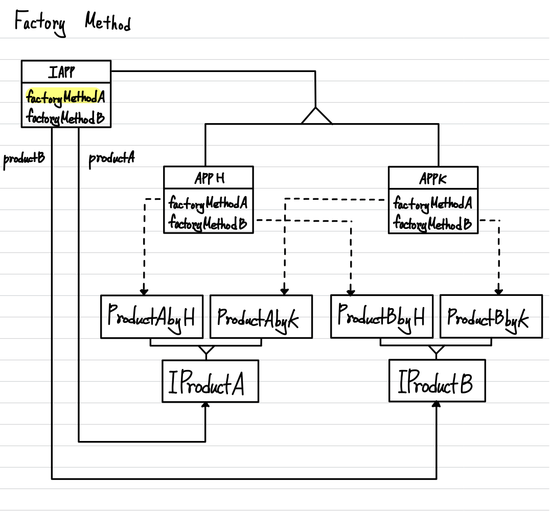 우리는 현재 factory라는 대상에게 object의 생성을 넘겼습니다. 또한, product 또한 추상화를 통해서 이것이 무슨 기능을 하는지는 어렴풋하게 알고 있지만, 이것이 정확하게 무엇인지는 모릅니다.(예전에는 정확하게 구두라고 지정했다면, 이번에는 두루 뭉술하게 신발이라고 쓰고 이를 사용하고 있다고 생각하시면 됩니다.) 그렇기 때문에 우리는 productA, productB라는 object가 정확하게 무엇인지도 모르고, 이를 만드는 방법 또한 모르는 상태입니다.