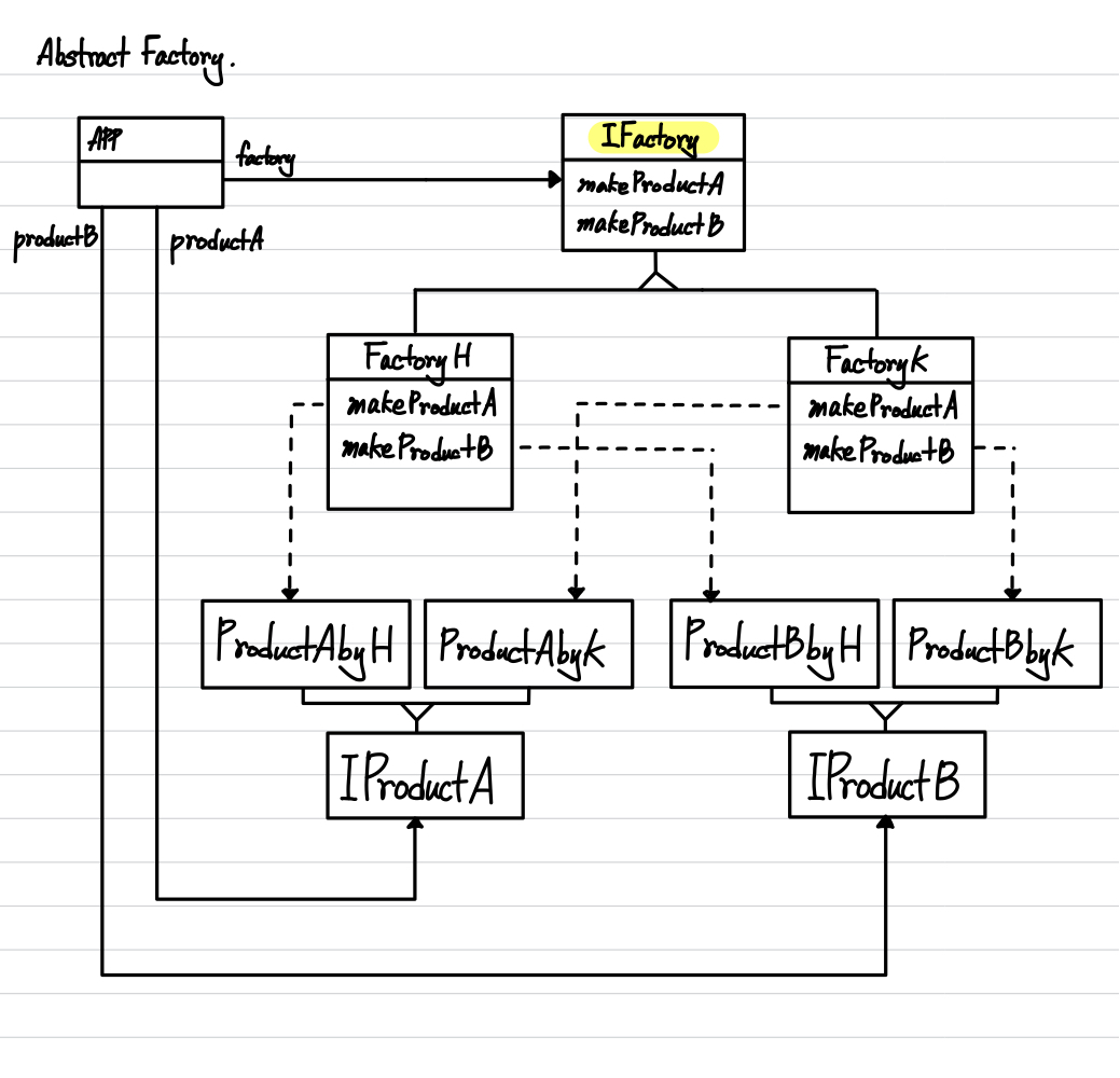 우리는 현재 factory라는 대상에게 object의 생성을 넘겼습니다. 또한, product 또한 추상화를 통해서 이것이 무슨 기능을 하는지는 어렴풋하게 알고 있지만, 이것이 정확하게 무엇인지는 모릅니다.(예전에는 정확하게 구두라고 지정했다면, 이번에는 두루 뭉술하게 신발이라고 쓰고 이를 사용하고 있다고 생각하시면 됩니다.) 그렇기 때문에 우리는 productA, productB라는 object가 정확하게 무엇인지도 모르고, 이를 만드는 방법 또한 모르는 상태입니다.