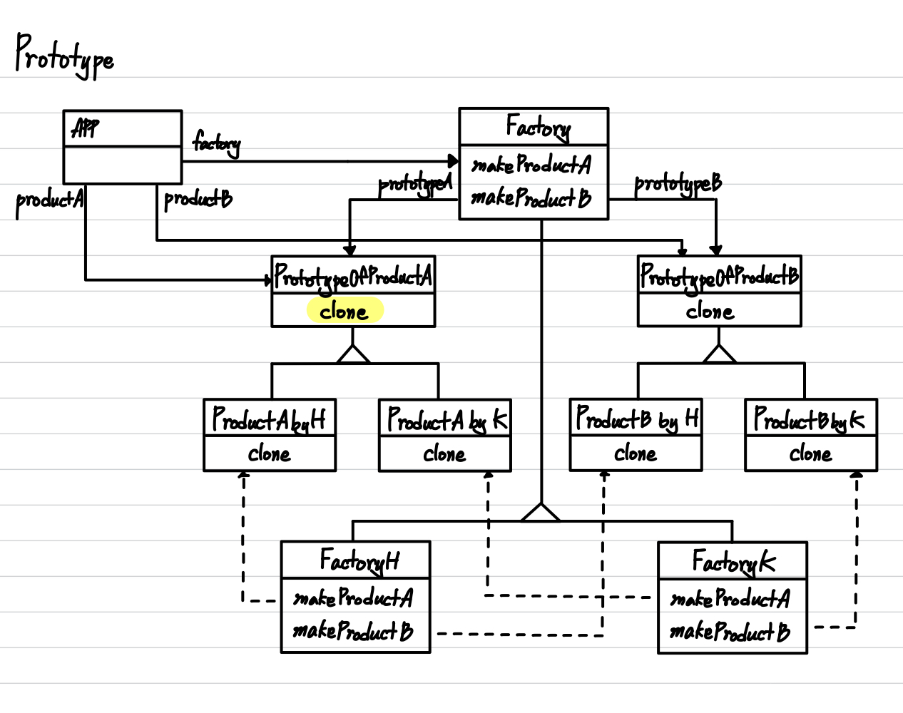 그렇기에 Prototype 방식에서는 clone이라는 method가 굉장히 중요합니다. (또한, 이 Prototype은 Singleton이라는 것도 아시겠지요?) 기존의 abstract factory 방식과는 다르게 Factory 자체에서 Prototype을 가지고 있는 것입니다. 그리고, 이를 이용해서 object를 생성한다고 볼 수 있습니다.