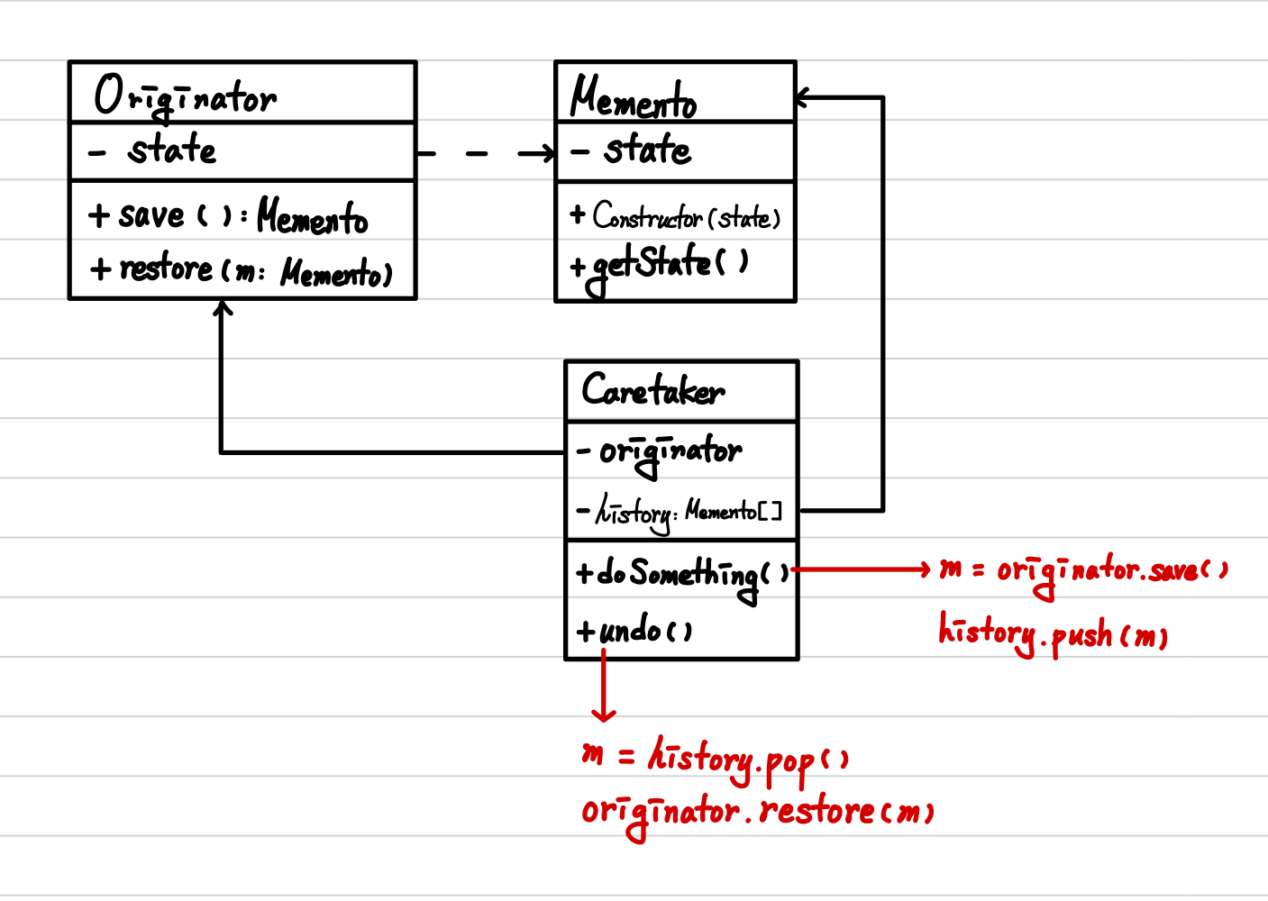 구현을 하기 위해서는, 본래의 object를 그대로 두고, 필요로 하는 private variables를 포함하는 memento를 구현하여 state를 받을 수 있는 method를 포함하게 해서, 이 memento들만 caretaker라는 object에서 list형태의 history로 저장할 수 있도록 합니다.