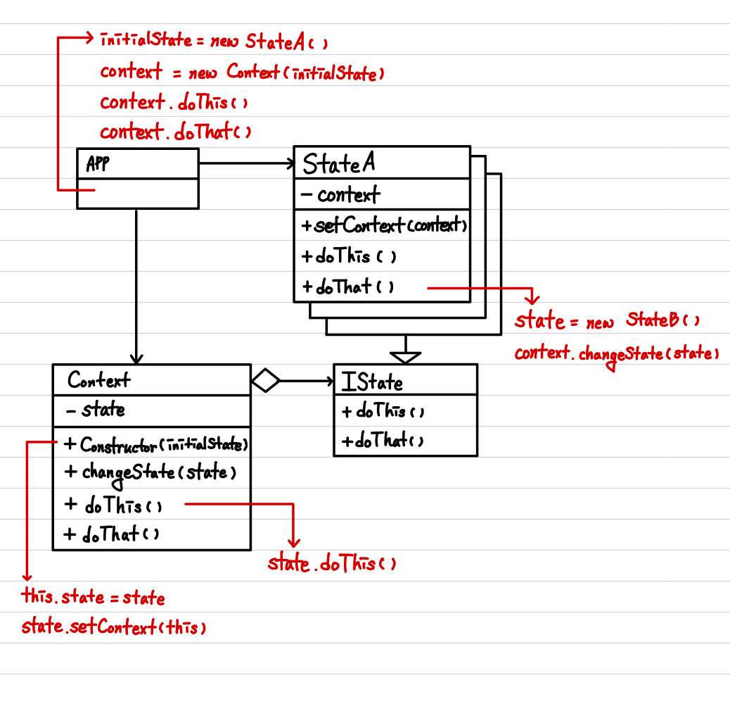 구현 시에는 각 State를 별도의 Class로 분리하고, 그 내부에서 변경되는 method를 직접 구현하도록 합니다. 따라서, 실제 state를 포함한 원본 class는 이 state에 정의된 method를 호출하도록 할 수 있습니다.
