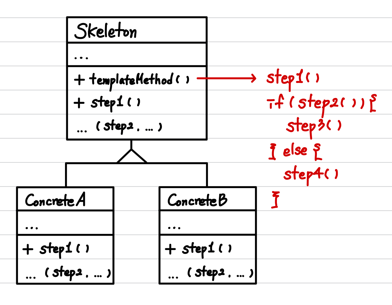 Template Method Pattern algorithm의 skeleton을 상위 class에 정의하고, 전체적인 구조는 바꾸지 않으면서 각 단계에 대한 구현을 override 하는 pattern입니다.