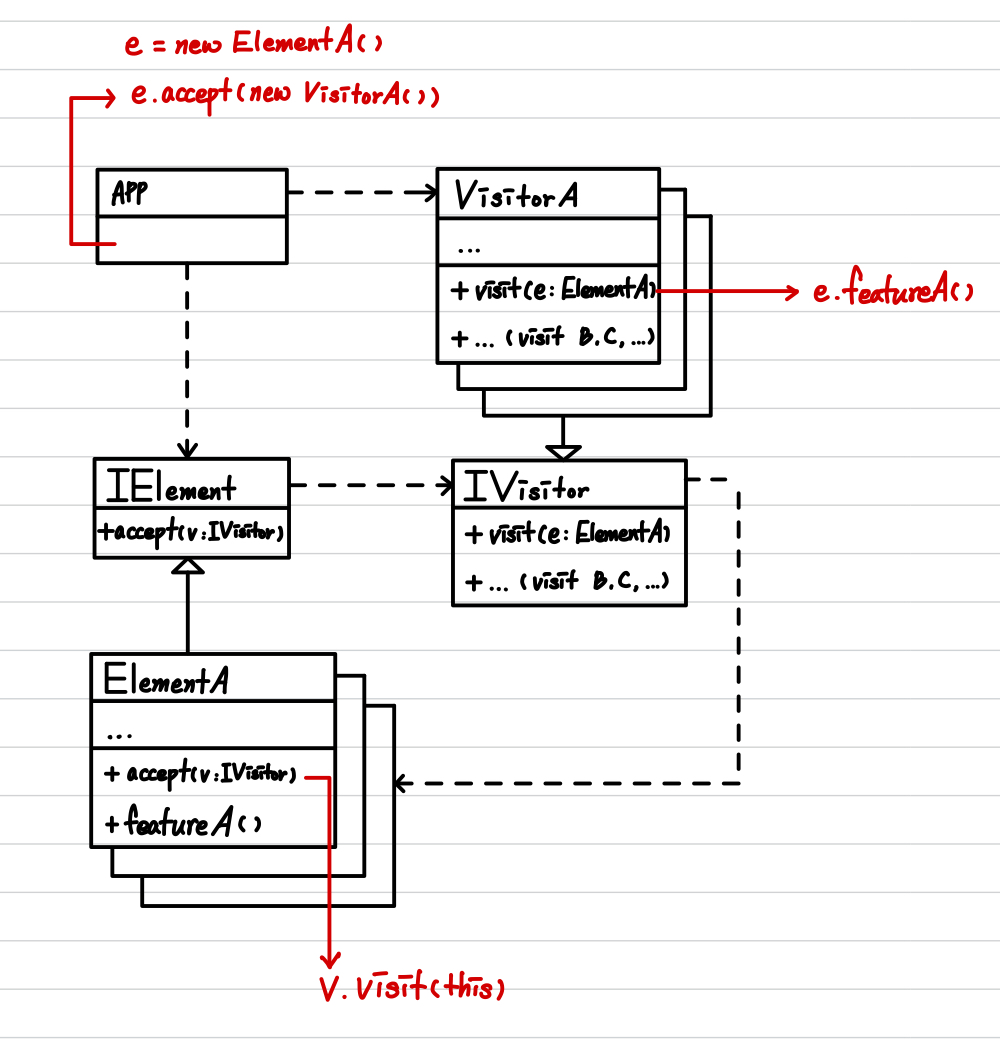 즉, 사용하고자 하는 object를 하나의 interface로 추상화하고, 각 object는 이를 사용할 client(visitor)를 허용할 것인지 그리고 어떤 algorithm을 수행할 것인지를 정의해둡니다. 사용할 수 있는 예시는 사용할 수 있는 Element의 종류가 매우 다양하며 계속해서 추가될 가능성이 높을 때 사용할 수 있습니다. 그렇지만, Visitor의 추가는 매우 어렵기 때문에 이에 유의해야 합니다.