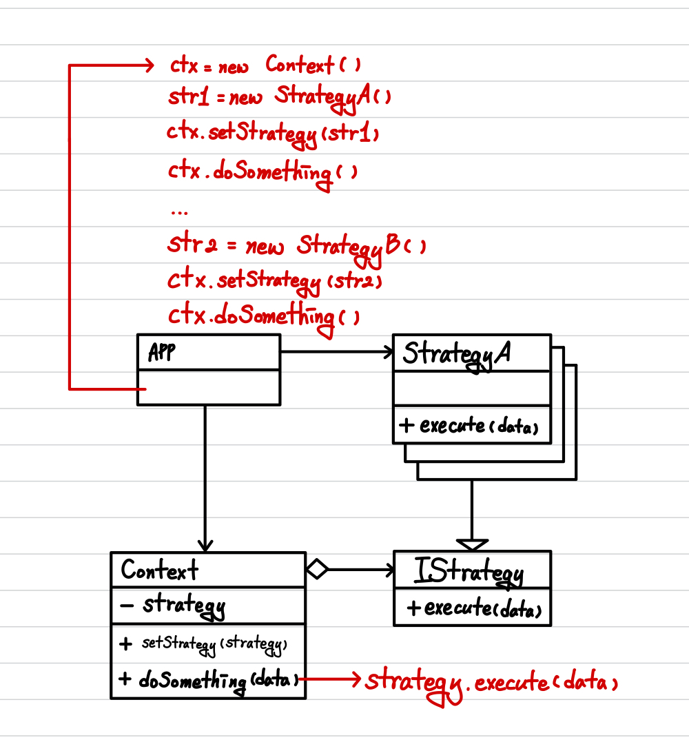 즉, object의 method 자체를 별도의 interface로 분리하는 방식이라고 이해할 수 있습니다. 앞서 보았던 state는 context(문맥)에 따라서, 상태가 바뀌지만 Strategy Pattern에서는 행위 자체가 바뀐다고 생각하면 됩니다.