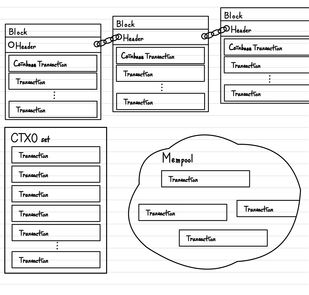 - UTXO set : 이전에도 살펴보았지만, 우리는 Transaction의 검증을 수행할 때 반드시 해당 Transaction의 사용여부를 확인할 필요가 있습니다. 따라서, 해당 Transaction 중에서 사용되지 않은 Transaction Output을 Blockchain에서부터 추출하여 별도로 저장하는 것입니다. 이를 통해서, 전체 Blockchain을 조회하는 것보다 빠르게 사용하지 않은 Transaction output을 찾을 수 있습니다.