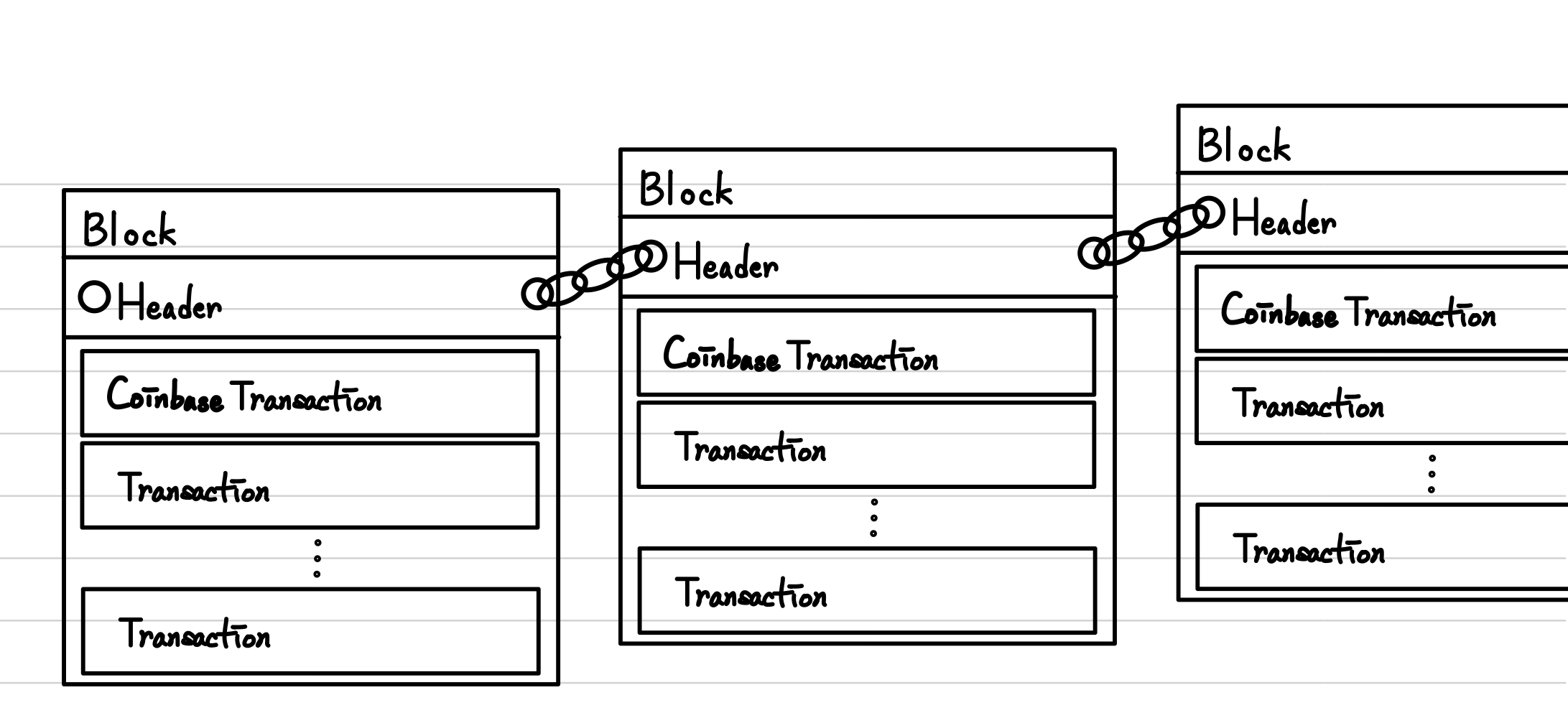 Block이란 Transaction을 저장하는 하나의 단위라고 볼 수 있습니다. 하나의 Block의 크기는 1MB로 제한되어있습니다. (물론 지금은 여러 다른 변종에서는 이 제한이 다르기도 합니다.)