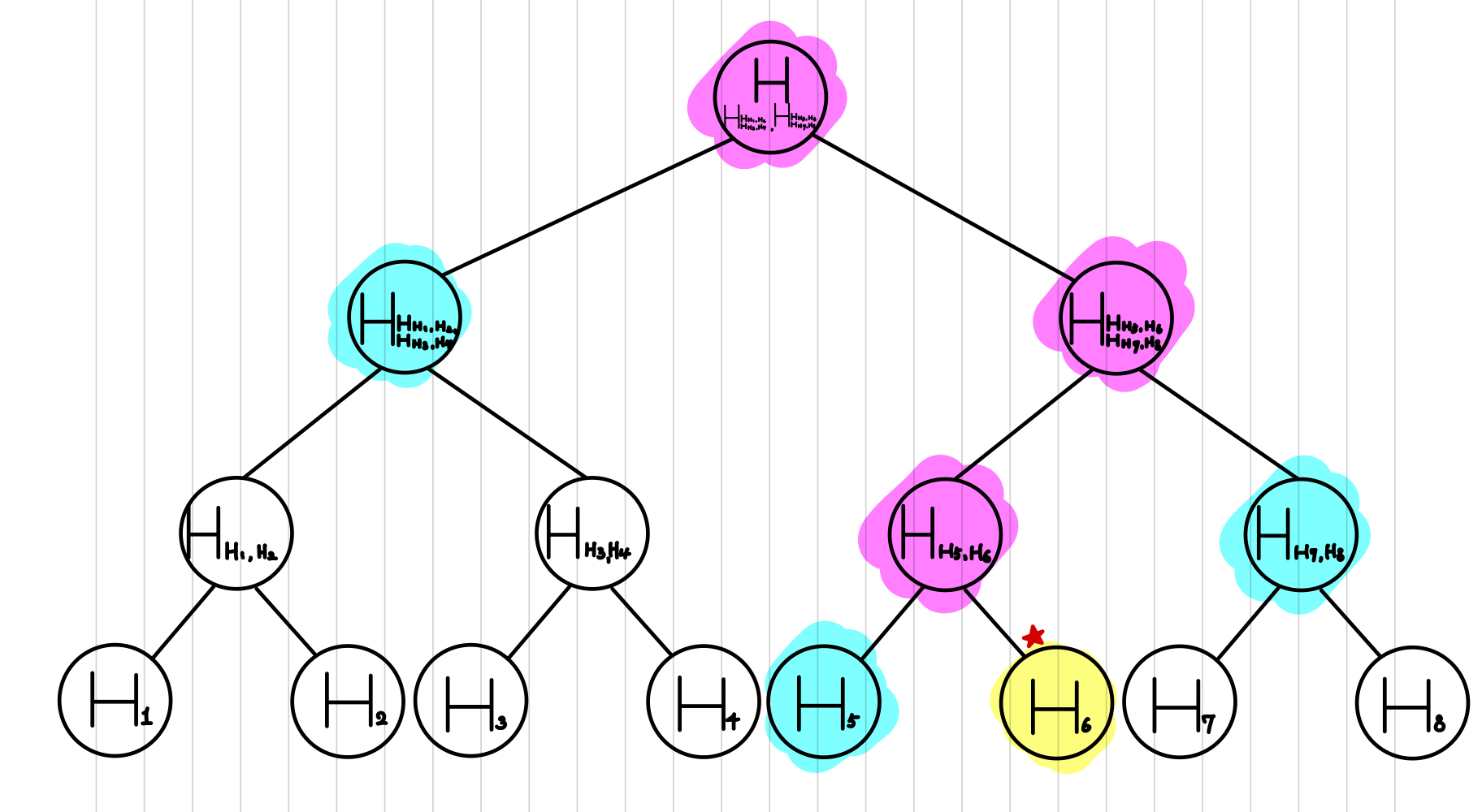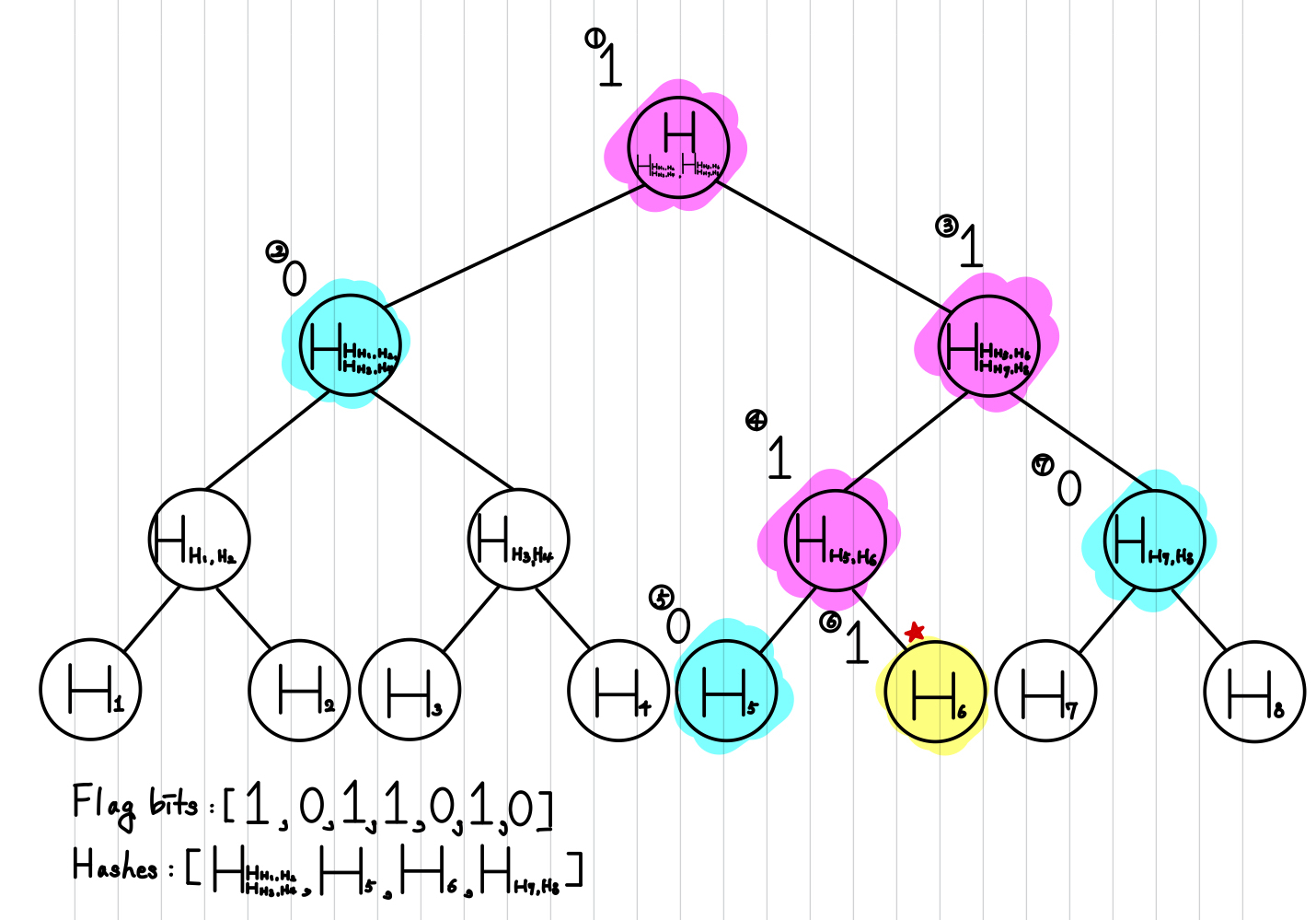 $H_6$ 라는 Transaction이 Merkle Tree의 포함되어있는지를 확인하기 위해서 다음과 같은 방식으로 사용될 수 있습니다. Light Node가 Blockchain에서 Transaction의 존재 여부를 확인하고자 할 때 다음과 같은 연산을 수행할 수 있습니다. 먼저, 근처의 Full Node에게 Flag Bit와 Hash 값을 요청하는 것입니다. 그리고, 이를 이용해서, 정말 $H_6$가 포함되었는지를 확인할 수 있습니다. Flag Bit와 보낼 Hash 데이터는 다음과 같이 선정됩니다.