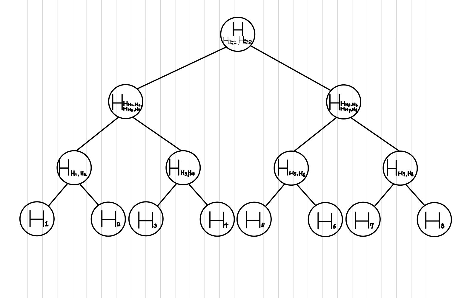 - 이제 각 leaf 노드에서부터 차근차근 위로 올라가면서, tree 구조의 모든 node의 값을 채울 것입니다. 여기서 parent의 값은 left node의 hash 값과 right node의 hash값을 이어 붙여서(더하는 것이 아니라 이어서 붙입니다.) 다시 한번 hash function을 적용하는 식으로 구합니다.