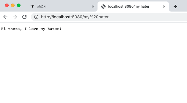 package main import ( "fmt" "log" "net/http" ) // handler는 responseWriter와 request를 받아서, // url 요청에서 root 주소를 제외한 값 중 가장 첫글자인 '/'를 제외한 값을 불러와 string에 끼워넣어 출력합니다. func handler(w http.ResponseWriter, r *http.Request) { fmt.Fprintf(w, "Hi there, I love %s!", r.URL.Path[1:]) } func main() { http.HandleFunc("/", handler) // url에 /를 붙이는 요청이 왔을 때, 수행할 동작은 hanlder임을 명시합니다. log.Fatal(http.ListenAndServe(":8080", nil)) // :8080으로 요청이 들어오면 위에 정의한 규칙에 따라 동작하도록 명시합니다. 이 과정에서 에러가 나는 경우 이를 기록할 수 있도록 logging하기 위해 한 번 감싸 줍니다. }